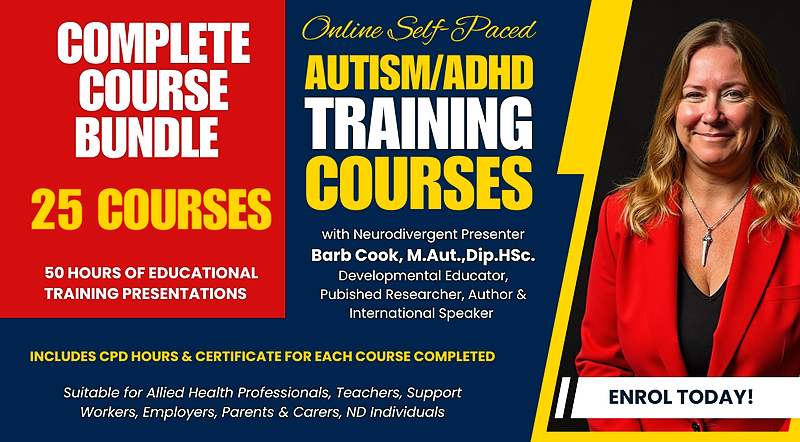 BundleAutism/ADHD/PDA Complete Course Bundle. 50 hours of educational training presentations and resources with Barb Cook, M.Aut.,Dip.HSc., Registered Developmental Educator, NDIS Registered Specialist PBS Practitioner, Integrative Nutritionist